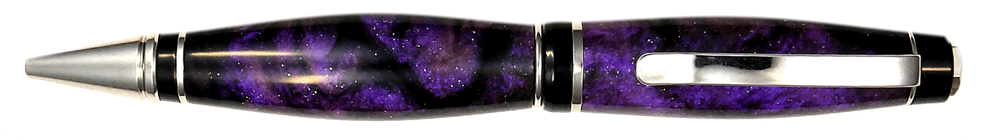 (1) The first pen has a Chrome finish, with a Purple/Pink Nebula resin body. The pen is just over 0.67" diameter at the widest point.