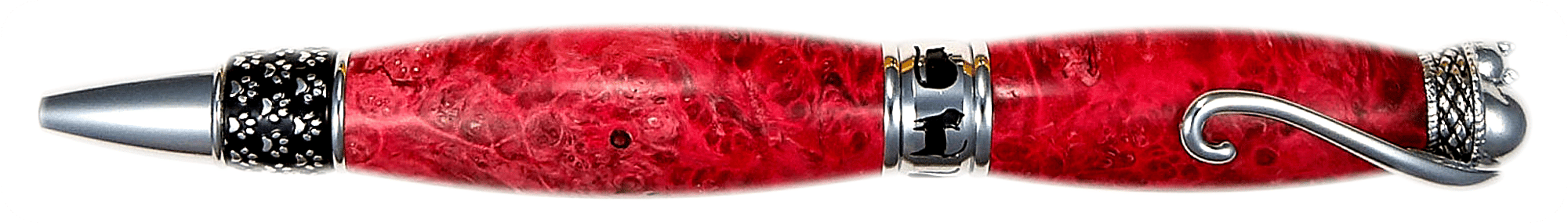 (2) The second pen has a Chrome finish, with a stabilized box elder burl body dyed red. The pen is just over 0.65" diameter at the widest point.