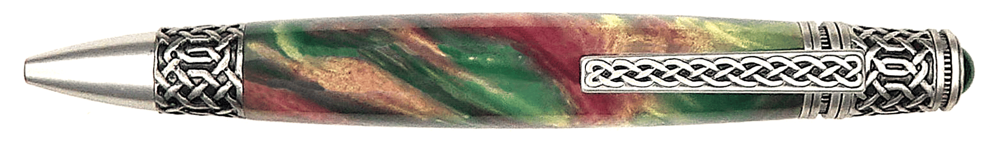 Three Celtic theme twist pens are available, as shown in the attached images, and the pens have a small emerald color cabochon at the top. The pens use a standard Parker style ball point pen cartridge (black ink included), and are about 5.1" in length.