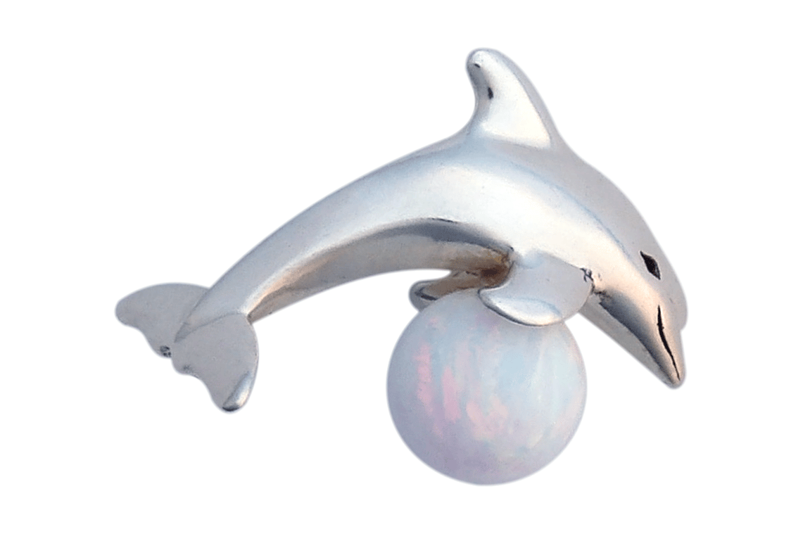A Dolphin Pendant in non-tarnish sterling silver as a pendant only, without chain. The included bead is an 8mm Kyocera Fire and Snow Simulated Opal. The pendant is approximately 23mm (0.9") in width, and 17mm (0.68") in height. The total weight of the pendant is approximately 0.12 Troy ounce with 8mm bead included. This is a fairly light pendant, and a recommended chain would be a 1mm Venetian Box Chain or equivalent.