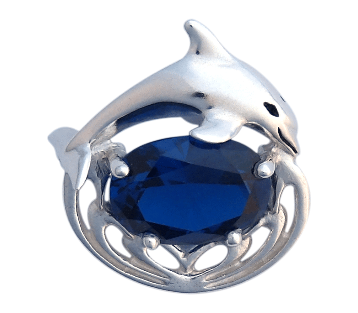 Non-Tarnish Sterling Silver Dolphin Pendant with Faceted Imitation Blue Sapphire