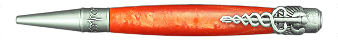 (2) The second pen has an Antique Brass finish with a Rhino Polyester Pomegranate Martini resin body. The pen is just over 0.6" diameter at the widest point.
