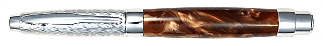 A Presimo theme rollerball pen in Etched Chrome finish, with an Aquabright Brown Dream resin body. The pen uses a RollerBall Schmidt brand refill (included). The pen as shown is a little over 5.1" in length, and about 0.57" diameter at the widest point.