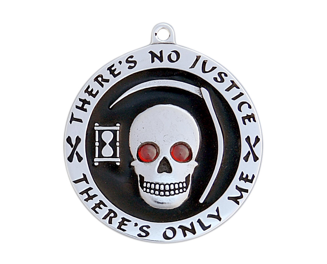 A Reaper Pendant in non-tarnish sterling silver as a pendant only, without chain. The eyes are red 4mm cubic zirconia (CZ) cabochons, and the background is a black UV cured U-NAMEL resin. The pendant is approximately 39mm (1.5") in diameter with a total weight of approximately 1 Troy ounce with CZ eyes and background included. Since this is a fairly heavy pendant, a recommended chain would be a 3mm Figaro or equivalent.
