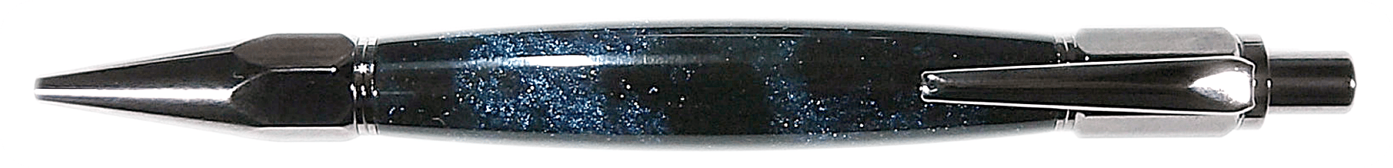 A Vertex theme click pencil in Gun Metal finish, with a Cosmos resin body. The pencil uses a heavy duty 2mm pencil lead (included). The pencil as shown is just over 5.7" long, and just over 0.58" diameter at the widest point.